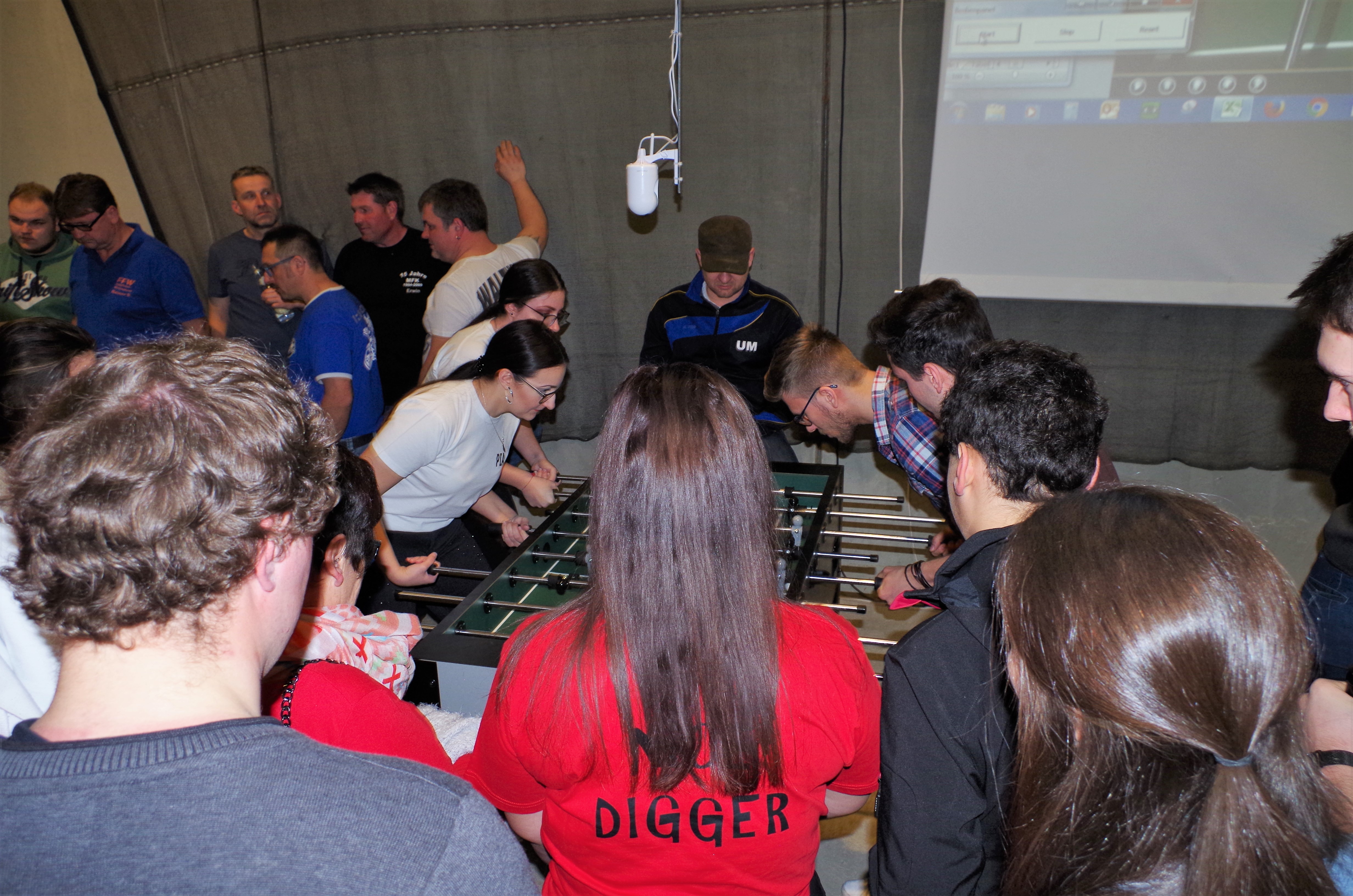 Mittels einer Live-Übertragung durch Webcams an den Kickertischen und einer sich ständig aktualisierenden Ergebnistabelle, die mit zwei Beamern an die Wand projiziert wurden, konnten die Zuschauer die parallel ablaufenden Spiele auf vier Profi-Kickertischen, die bei einem Automatenverleih in Stein ausgeliehen und von der Firma Schaumann gesponsort wurden, gut mitverfolgen.